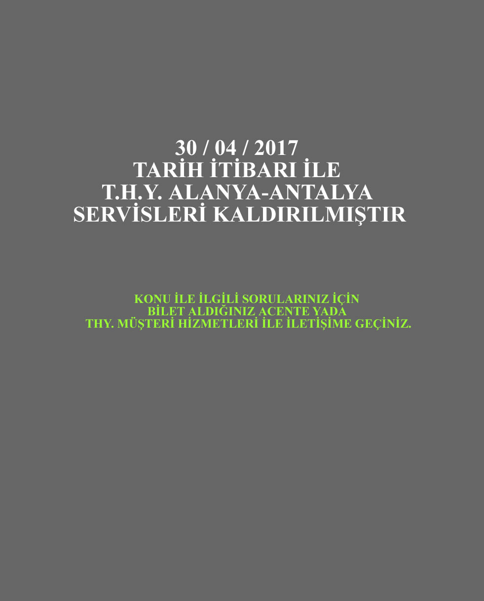 ÖNEMLİ DUYURU : TÜRK HAVA YOLLARI ( THY ) ALANYA - ANTALYA HAVALİMANI OTOBÜS SERVİSLERİ 30 NİSAN 2017 TARİHİNDE SONLANACAKTIR. |
