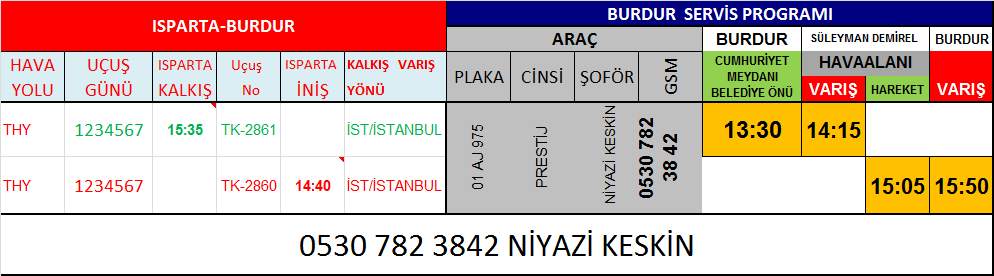 TÜRK HAVA YOLLARI ( THY ) BURDUR - ISPARTA SÜLEYMAN DEMİREL HAVALİMANI SERVİS PROGRAMI AŞAĞIDAKİ TABLODA VERİLMİŞTİR. Servisimiz ücretli olup Araç içerisinde Bilet kesilerek tahsilat yapılmaktadır. Bilet almadan kesinlikle ödeme yapmayınız.. |